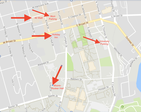 Directions: This is a little confusing so pay attention! The new Terry College campus consists of four connected buildings around an open quad. It also slopes downhill so if you enter the complex from Lumpkin street you will be on the second floor. If you enter from Hull street, going thru the arch puts you on the 1st floor. Going up the steps from Hull Street puts you on the 2nd floor. Moore-Rooker Hall is the west side of the complex (adjacent to Hull Street.) The Stelling Family Study is only accessible from the outdoor balcony/walkway on the 2nd floor. Finally the terrain is hilly, so you might consider the shoes you wear.
